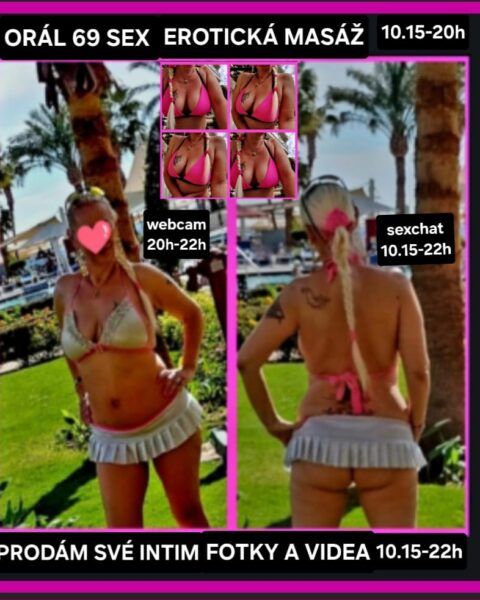 Ahoj?Jsem profesionální společnice ,modrooká blondýnka s krásnou, velmi těsnou mušličkou?.Přijímám pouze Čechy.Objednání pro nové klienty pouze telefonicky!☎️.Platba na účet, hotovost.Nabízím er.služby pro slušné,milé pány.v čase od 10.15- 20.00h.Kl.sex,orálek s, bez,69,lízaní,er.masáž těla,er.masáž penisu,30min 2000Kč/.40min 2500Kč 60min 4000Kč.( Orál bez-bez příplatku)Pozn.k masáži, masáž těla,lze pouze v 40min a v 60min a můžeš ji využit před vyvrcholením,jako oddalení orgasmu,nebo jako relax na závěr.? Masáž těla nelze v 30min.Dále doplňková online služba Webcam sex- ( pouze od 20h-22h dle času,webka se domlouvá minimálně 30min předem)cena webky 20min- 1800Kč.-Dále služba sexchat-(10.15- 22.00hdle času) er.chat+vkládáni mých intim.fotek do er.chatu- cena sexchat 20min- 1500Kč.Dále Prodám mé intim.fotky a žhavá intim videa,jak si hraju sama s vibrátorem.-vice info whatsaap,videa a foto,posílám okamžitě přes whatsapp po převedení částky na účet Ohledně zájmu o foto/ videa,cam sex,sex chat-piš whatsapp.Videa jsou velmi rajcovní,velmi intimní, erotické, uvidíš úplně vše,odkrytá anonymita prsíčka,zadeček,mušlička,úplně vše i z blizka ze všech úhlů.Pokuď si chceš být jistý,kdo ti otevře a do čeho jdeš a s kým budeš mit tu čest, máš možnost vidět co je ve mě,a odhalít všechny mé ženské zbraně.Nahota,anonymita bez cenzury- odhalení anonymity!!Mé videa,o mě řeknou to, co vše o mě potřebuješ vědět.Uvidíš můj obličej,oheň v těle,temperament,prostě vše!! Kup si fotky, videa, a odhal pani tajemnou, vyslékni si mě, uvidíš sám, co skrývám a jaké ženské zbraně na tebe použiju!Vypadám jako anděl, ale ve skutečnosti jsem anděl s ďáblem v těle, což můžeš odhalit zakoupením videí.a než se ke mě vydáš, už budeš vědět o mě vše!a můžeš si předem udělat fantazii, jak budu řádit s tebou pak osobně!!Camsex,je pro mě job vedlejší a je možný dle mého času.Rozdíl mezi zakoupením videí a camsex je ten, že videa ti zůstávaji na vždy…a můžeš si je kdykoli pak pustit,ale camsex je jen na chvíli. A sexchat s mými intim.fotkami ti také zůstává.Rozhodnutí je na každém.Jsem temperamentní okouzlující ,sexy, hodinová, profesionální společnice, která ti bude věnovat maximální péči po celou dobu návštěvy. Mám super přìstup ?a jsem velmi přátelská?Přijď si odpočinout od všedních starostí a upustit páru.?Budeš vrnět jako kocour a odcházet maximálně spokojen!??. P.s- Pracuji na ?%a můj exklusivní servis je na špičkové kvaltní úrovni?%Vím co chci, znám svou cenu,vím co dělám,vim co dokážu, vim co je ve mě. Pracuji kvalitně a kvalita se plati,nikoho nešidím,ani na servise,ani na čase, každý dostane to,co si zaplatí❗️ Nu,co už tu budu povidat?,přijď a přesvědč se sám osobně??♂️?Pusu Sabinka- hodinová milenka?Souhrn- reál schůzka denně od 10.15- 20.00.Dle času objednej se s předstihem.Prodej foto/ video od 9.00- 22.00h dle času Sex chat od 10.15- 22.00h dle časuWebcam sex pouze večer od 20h- 22h dle času.objednáni webky je minimálně 30min předem.Přes den jsem většinou dost zaneprázdněná ,takže proto webka lze pouze takto večer.
